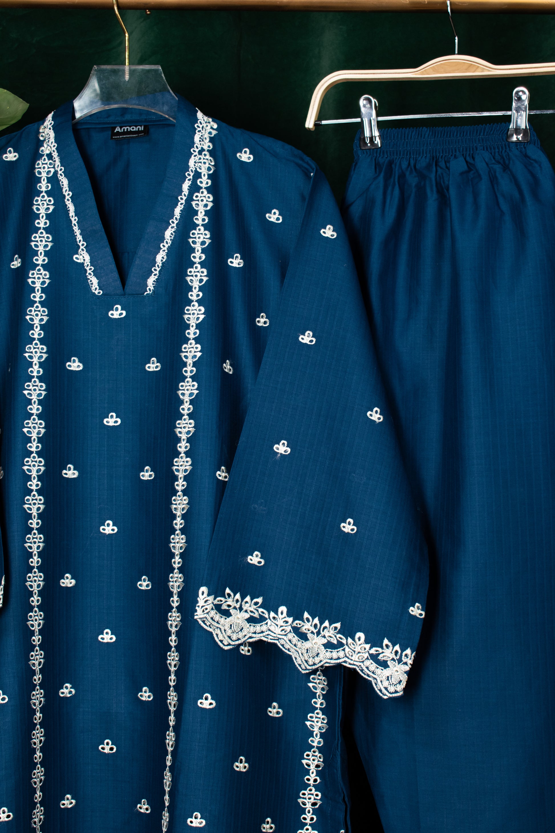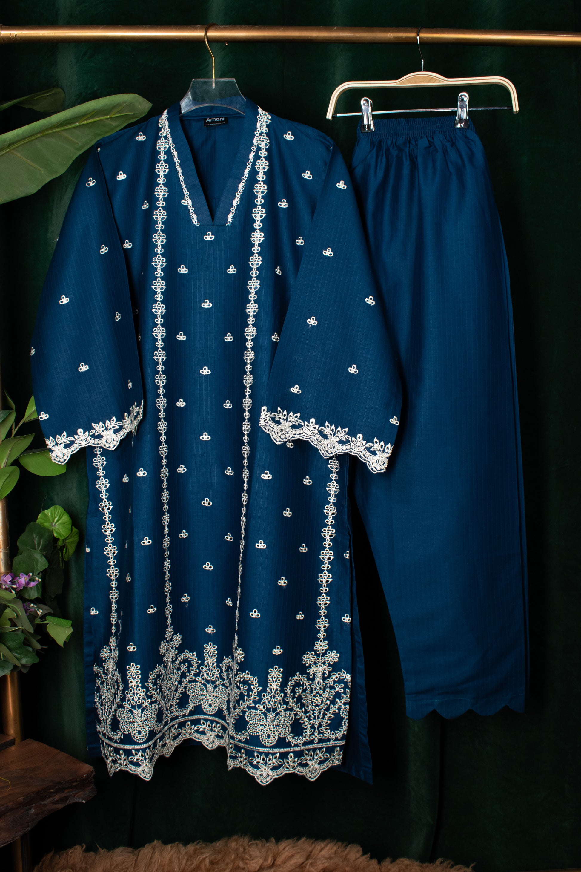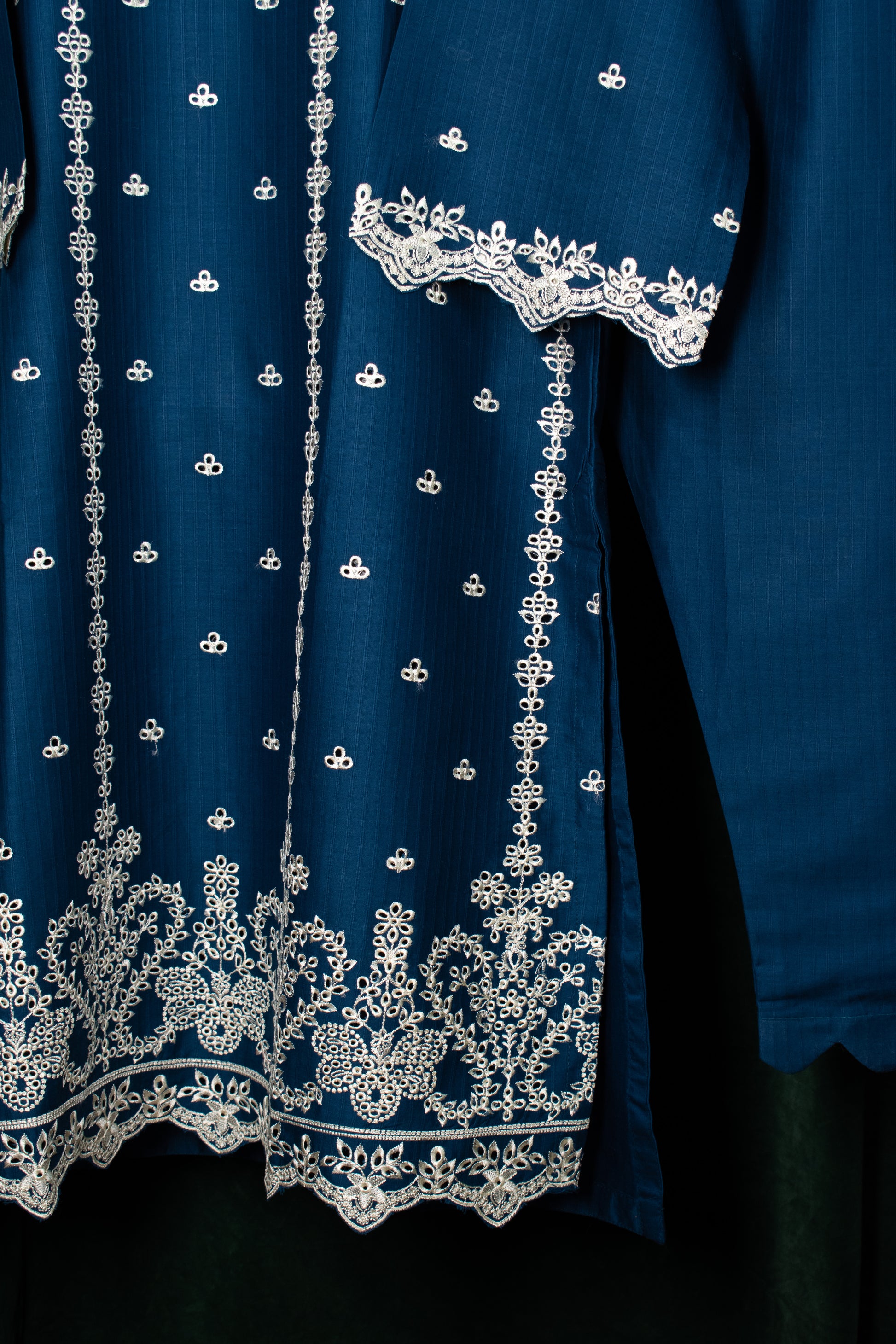 This elegant blue shirt features delicate white Schiffli embroidery, adding a touch of timeless charm. The intricate cutwork hem enhances its beauty, making it a perfect blend of sophistication and style.