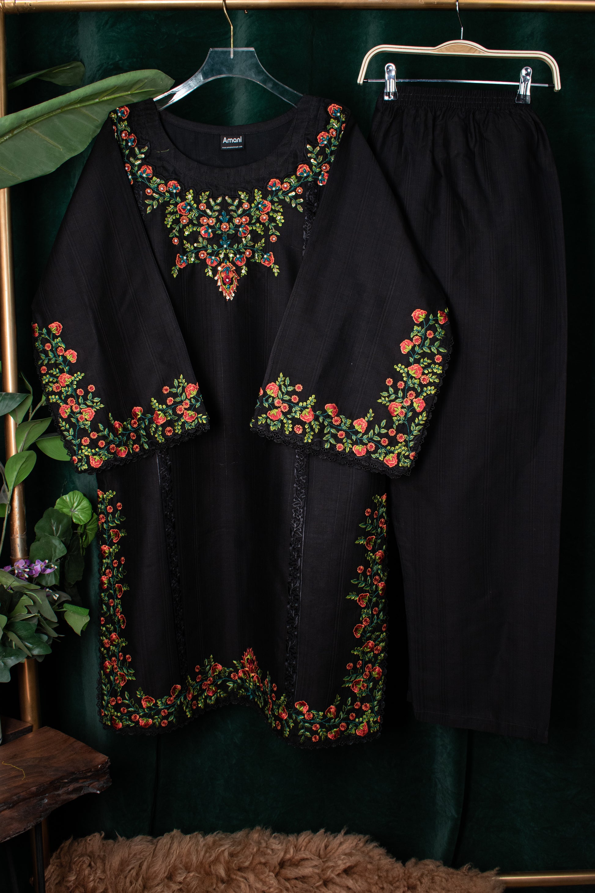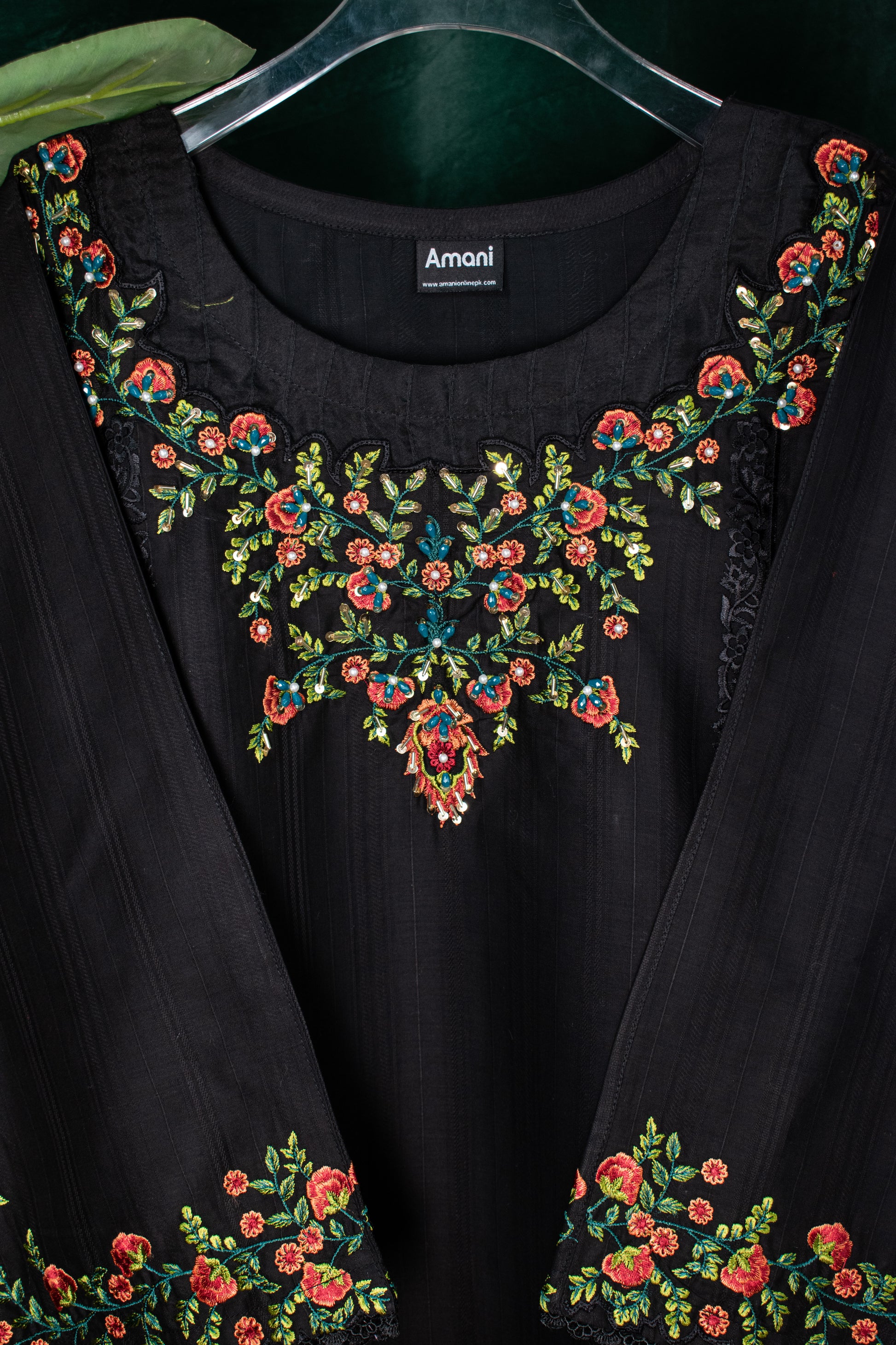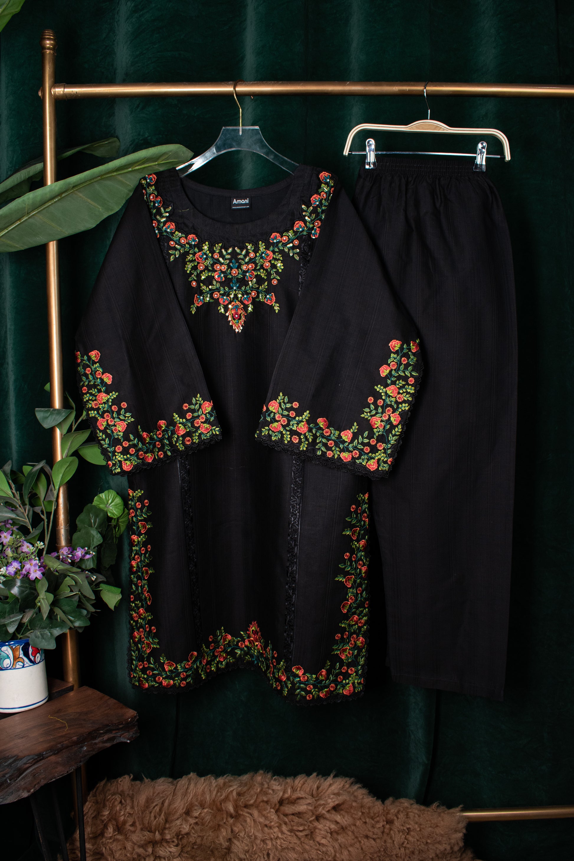 Make a statement with this stunning black ensemble, adorned with intricate floral embroidery and delicate hand embellishments. The elegant detailing on the sleeves and hem, paired with artisanal handwork, adds a touch of grace and sophistication, perfect for any special occasion.